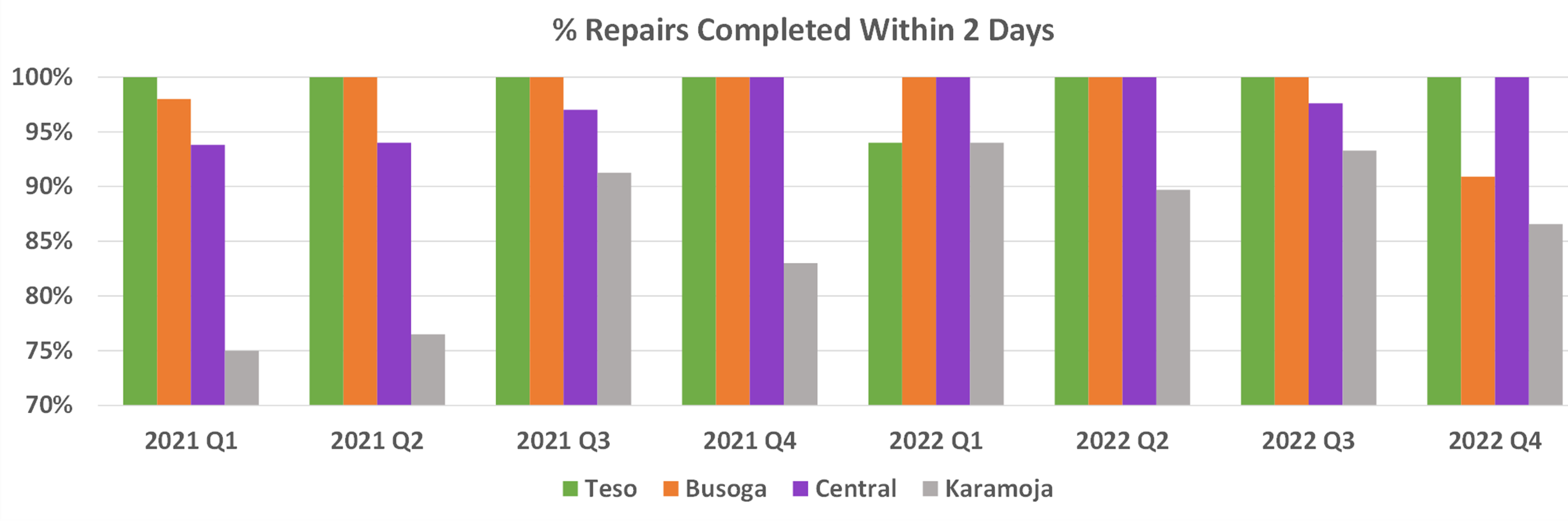 The PMA technicians are trained to replace worn parts before they break and respond quickly to breakdowns, so ensuring reliable water supply. Parts lifetimes and replacement costs is monitored carefully to optimize life-cycle costs and to generate information for government on tariff-setting. The chart below shows the percentage of breakdowns which are fixed within 2 days.