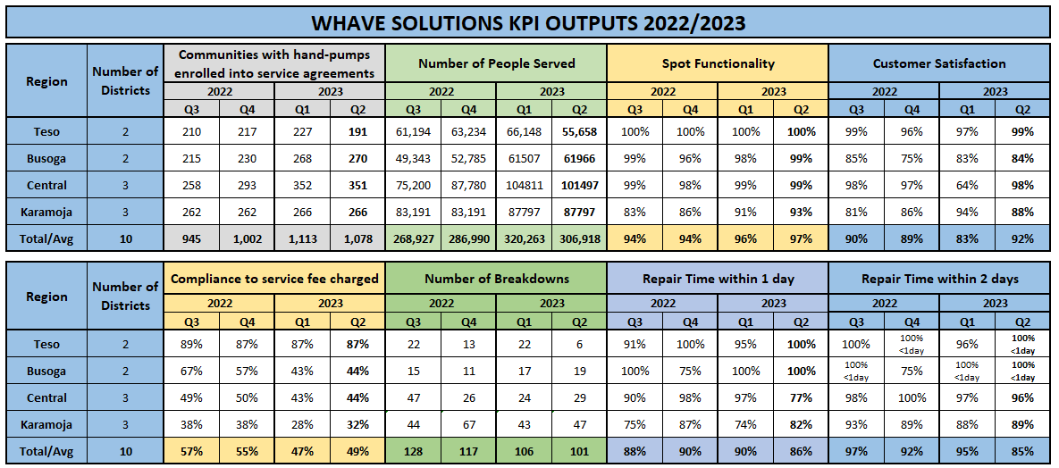 An independent survey team visits every waterpoint serviced by Whave, to spot-test for functionality using the national procedure. We also measure repair time as an additional metric (see below).